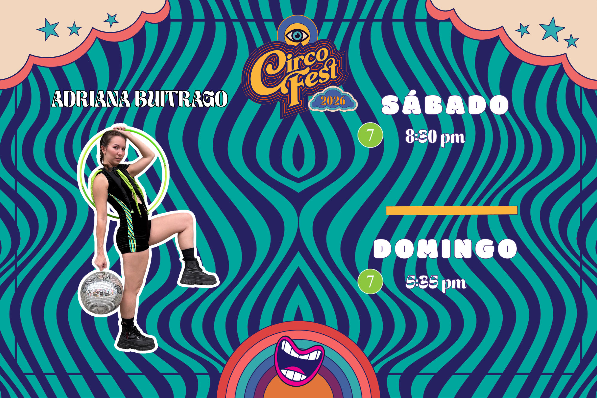 Adriana inicia con un solo aro que se multiplica y acelera hasta desafiar la gravedad, mezclando precisión, comedia e interacción con el público.
